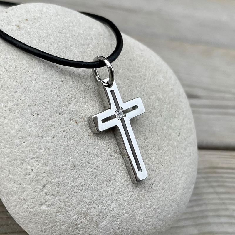 Kors i rostfritt stål med en liten glaspärla där korsets armar möts.