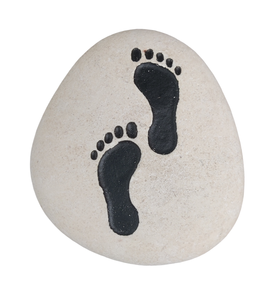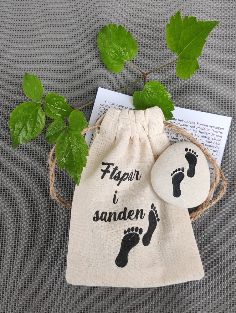 Versen "Fotspår i sanden" har fått hjälpa människor under många år. Detta inspirerade oss att ta fram en liten sten med fotspår på.