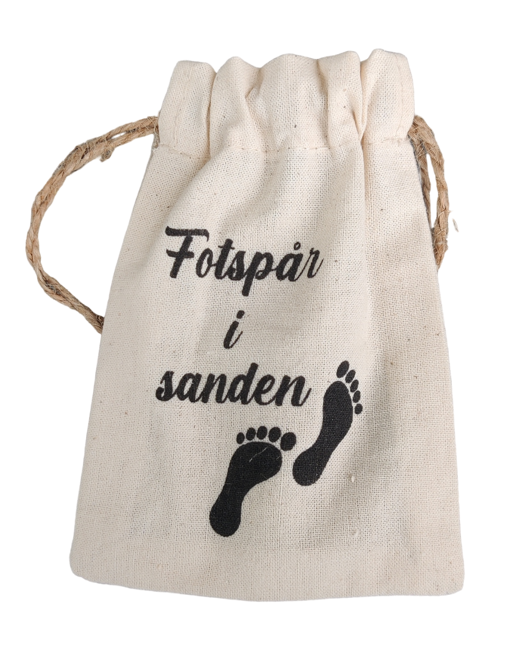 Stenen ligger i en tygpåse och det följer med en liten folder med hela texten från versen "Fotspår i sanden".